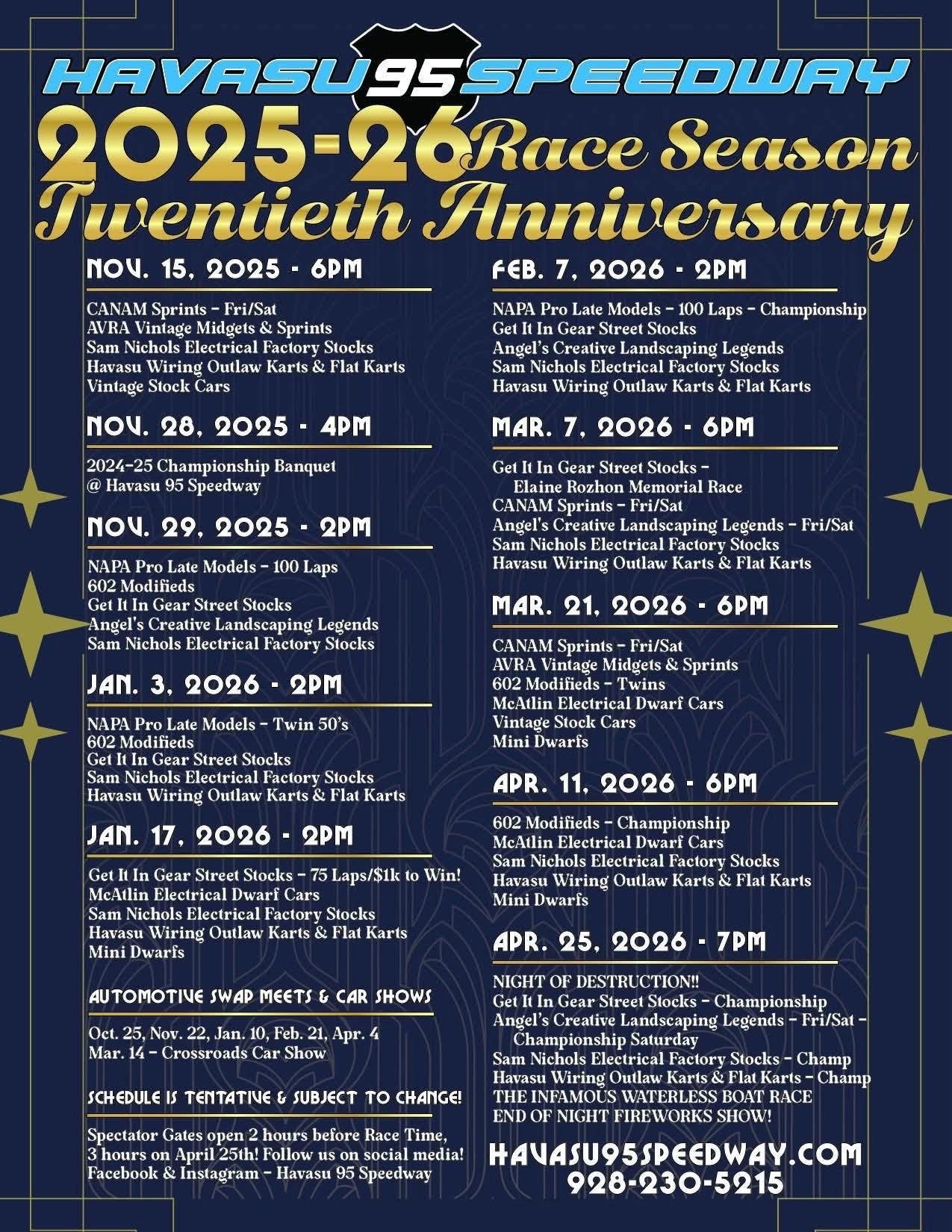 - Havasu 95 Speedway (Lake Havasu City, AZ) - A fun, tight oval that produces close racing and strong community support.